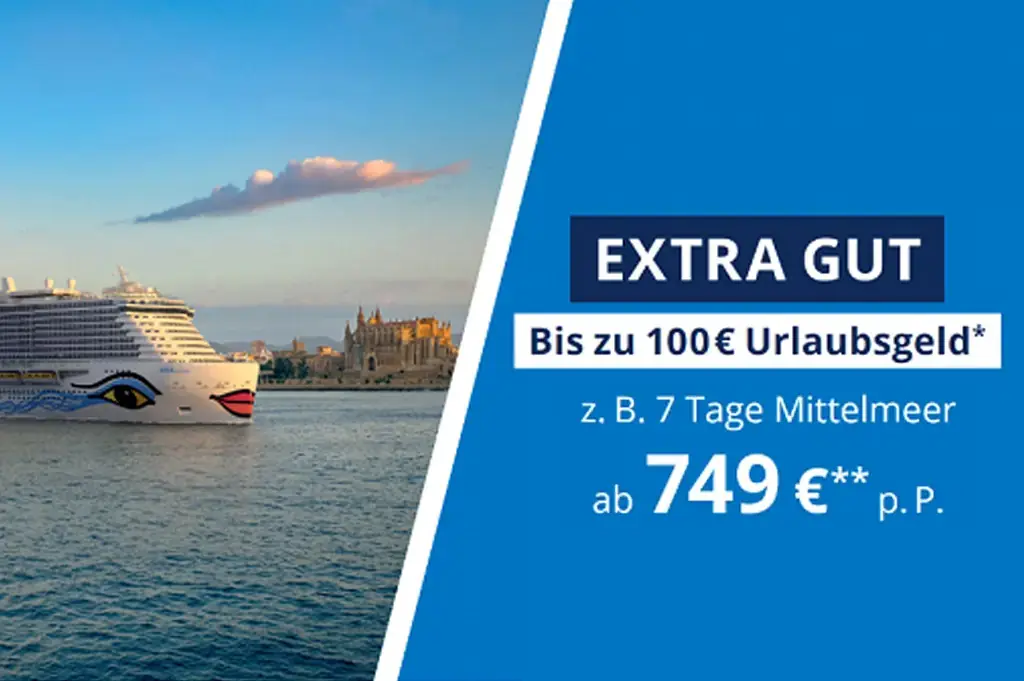 Mit der AIDA Bordguthaben Kampagne profitieren Sie bei ausgewählten Reisen von einem exklusiven Extra für Ihre Urlaubskasse. Bis zum 23.03.2026 erhalten Sie bei Buchung mit dem Aktionscode URLAUBSFREUDE bis zu 300 € Bordguthaben pro Kabine.