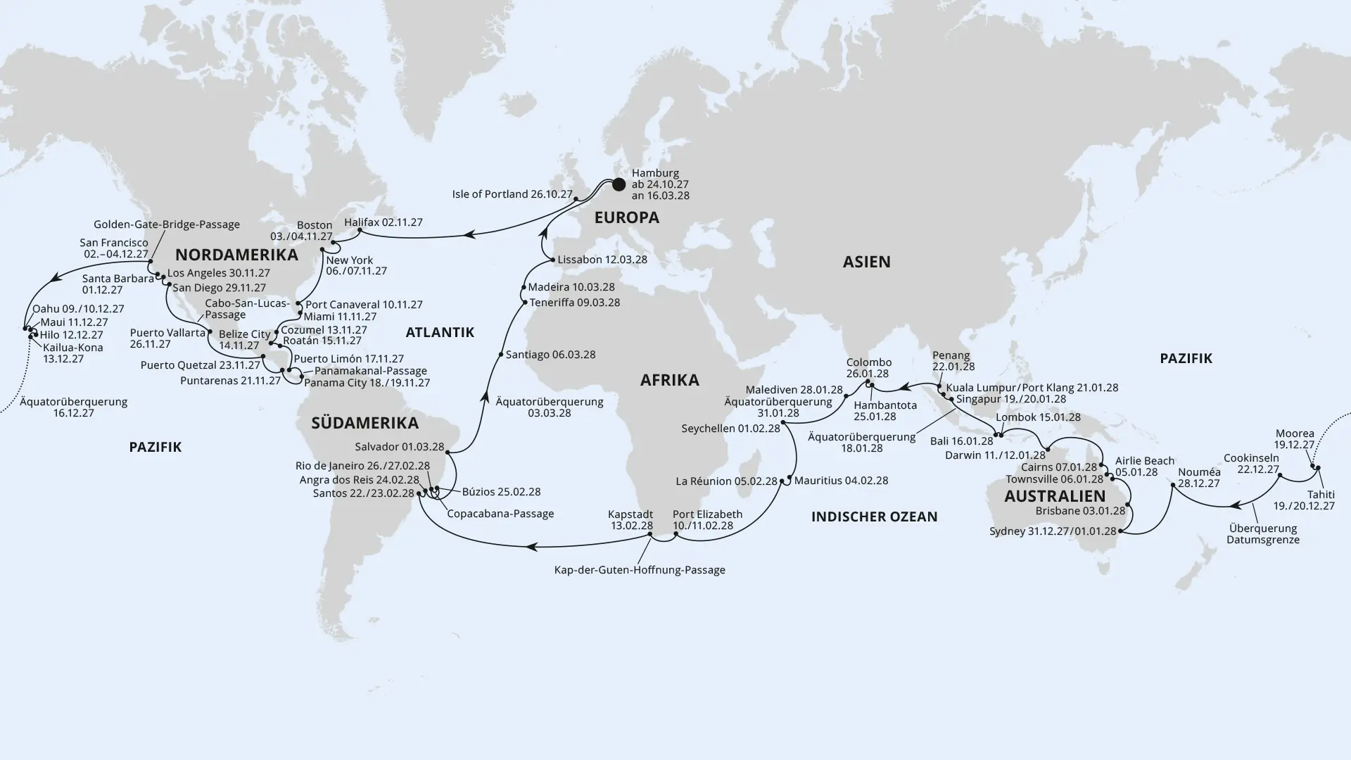 Overnight-Häfen: New York · Panama City · San Francisco · Honolulu · Tahiti · Sydney · Darwin · Singapur · Port Elizabeth · São Paulo/Santos · Rio de Janeiro